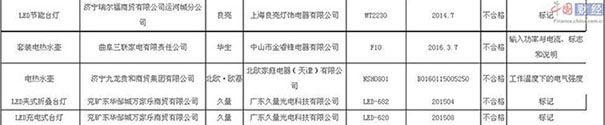 抽检发现5批次商品不符合标准的规定,合格率95%。不合格项目主要为输入功率与电流、标志和说明、工作温度下的电气强度等。其中,标称中山市金睿锋电器有限公司生产的1批次F10型华生套装电热水壶,被检出输入功率与电流、标志和说明项目不合格;标称北欧家庭电器(天津)有限公司生产的1批次NSH0801型北欧•欧慕电热水壶,被检出工作温度下的电气强度项目不合格;标称广东久量光电科技有限公司生产的1批次LED-682型久量LED夹式折叠台灯、1批次LED-620型久量LED充电式台灯,及标称上海良亮灯饰电器有限公司生产的1批次MT2230型良亮LED节能台灯,被检出标记项目不合格。